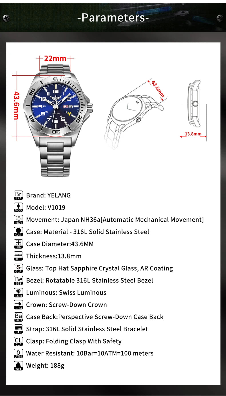 Yelang V1019, 44 mm, NH36, professional waterproof to 100 m